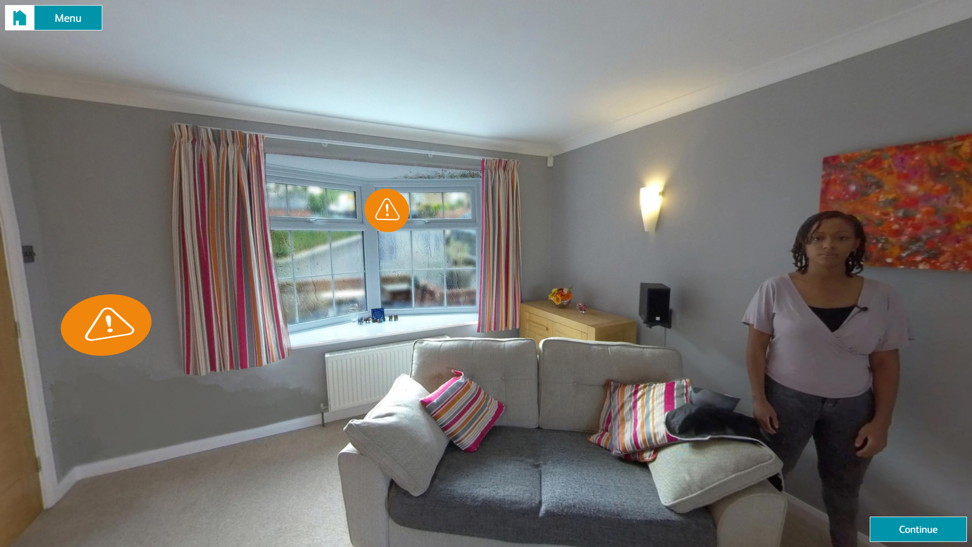 The real strength of this module was the inclusion of four 360° panoramas, each edited to display how damp, mould or condensation might look in someone’s home. They featured realistic features, such as condensation on a window or water marks on the ceiling, to help learners to spot issues in their customers’ homes.